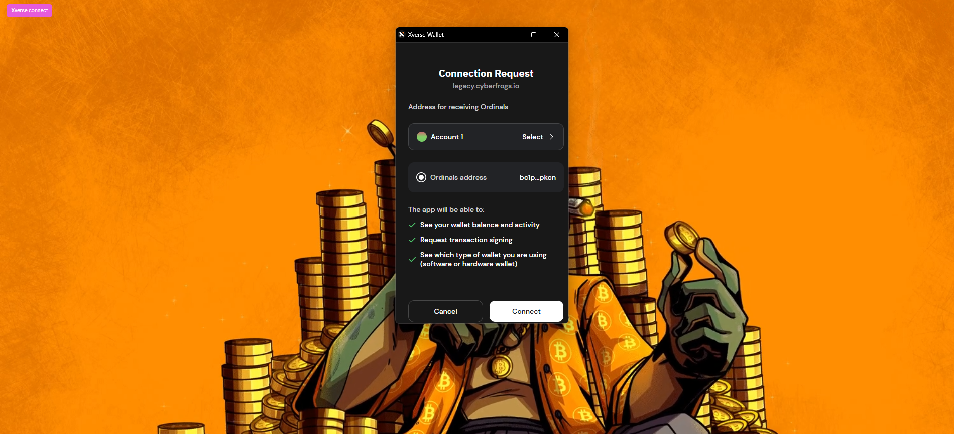 1. Go to <https://legacy.cyberfrogs.io/thor-btc> and connect your Xverse wallet.
